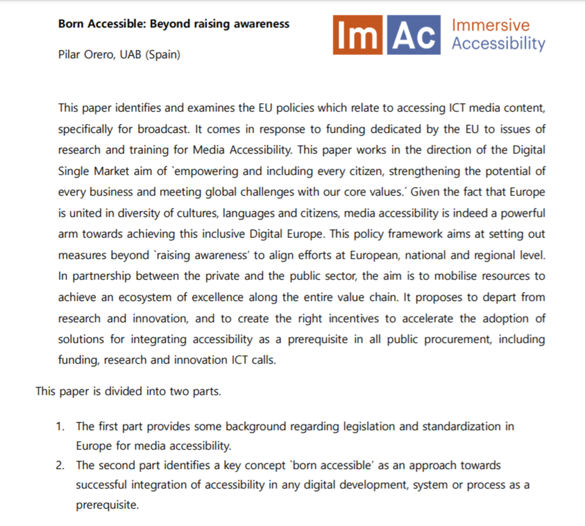 ImAc is one of the projects behind “Born Accessible” Policy Paper written by Pilar Orero for the Accessibility Day at the European Parliament 2020. The event was going to take place on 17th March but has been rescheduled for next Autumn.