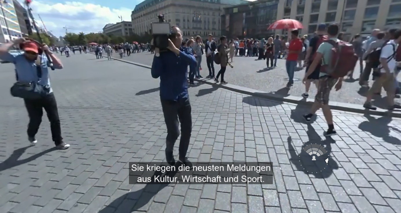 The below picture shows an example. Two crew members of the film team are shown, but the subtitle relates to the reporter who is not shown in the picture. A circle in the picture simulates a “radar”. A white arrow in the “radar circle” indicates that the reporter is right of the field of view.