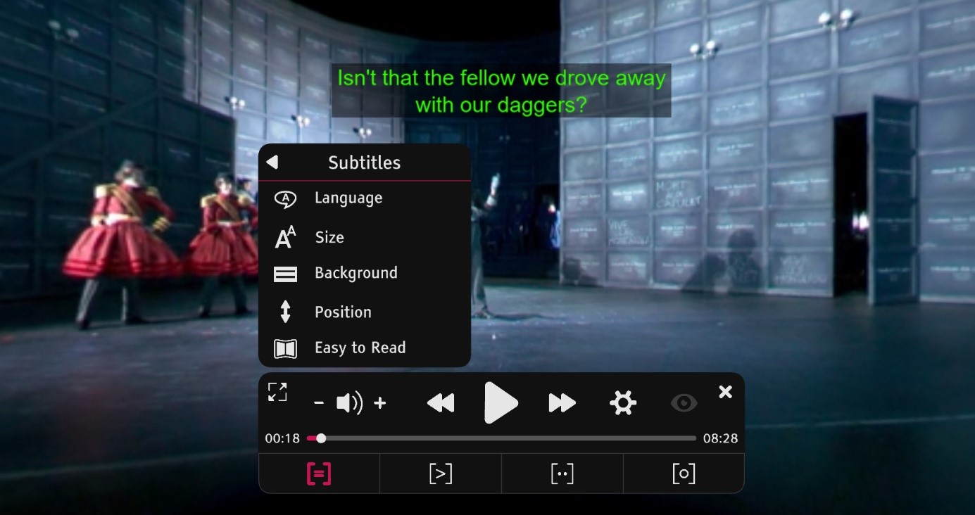 We see a great need for personalisation options especially when using head mounted displays (HMDs). The quality range of the image in these devices requires to use larger font sizes than for traditional subtitle services. Additionally, users reported that they prefer the subtitles moved further into the center of the picture. The ImAc player allows to adjust presentation to personal taste and to the displaying device with the following settings: