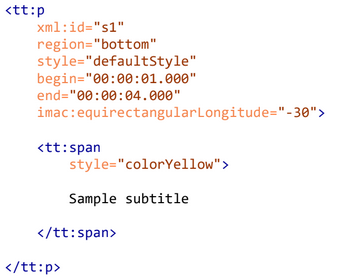 As an example, here’s a snippet from an IMSC file including the custom attribute “equirectangularLongitude” describing the horizontal angle from the center of the video where the speaker is located: