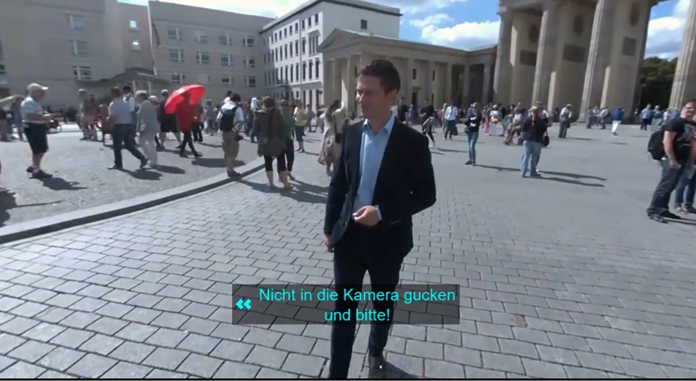 The below picture shows an example. A reporter is in the current field of view but the subtitle is related to the instructions of the director (who is not visible in the picture). An arrow at the second line of the subtitle points to the direction of the speaker (in the case the director). The subtitle text is “Nicht in die Kamera gucken und bitte”. This translates into “Do not look into the camera and action!”