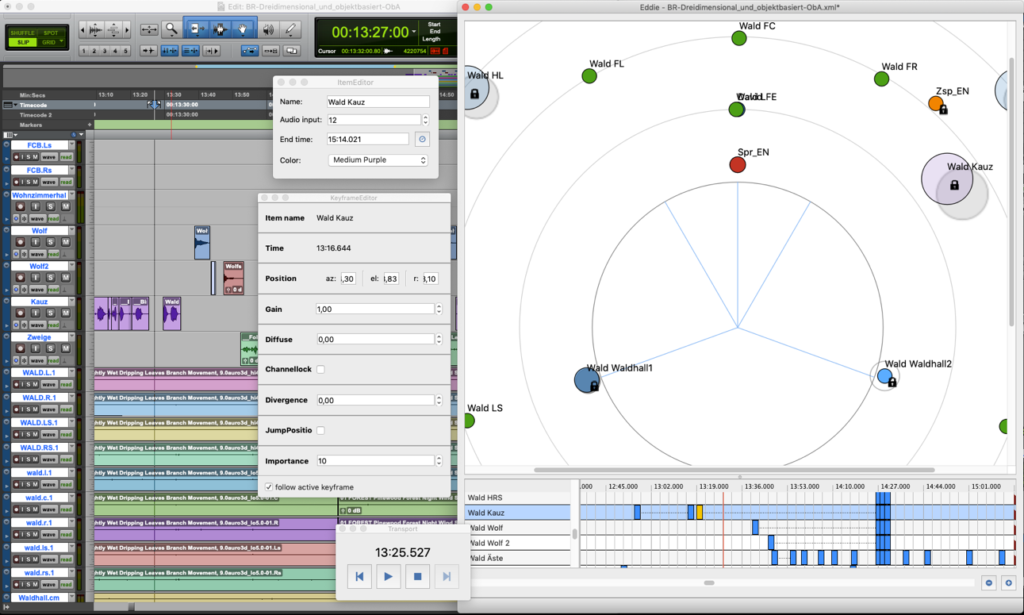 Eddie is an object-based audio (OBA) editor with a graphical user interface. It can be embedded in an OBA production workflow in order to add metadata to audio objects. Eddie connects to any digital audio workstation (DAW) and controls the scene rendering by sending metadata and control commands via TCP/IP to a renderer instance.